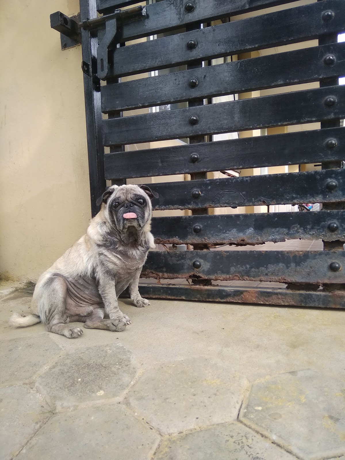 This pug always wanted to be with his owner. Atleast near his home but he lives in another place near the owners home. This pug loves the owner but he does not pay much attention to it other than feeding it water and some pedigree. The dog used to be chaned and kept in a single place for 24 hours a day except when a care taker takes it for a short walk in the evenings. Recently it is untied and kept, the excitement and freedom it experiaced bounted no limits. It was moving up and down the whole days. And now it likes to peek into his owner's house. It keeps pushing this locked gates